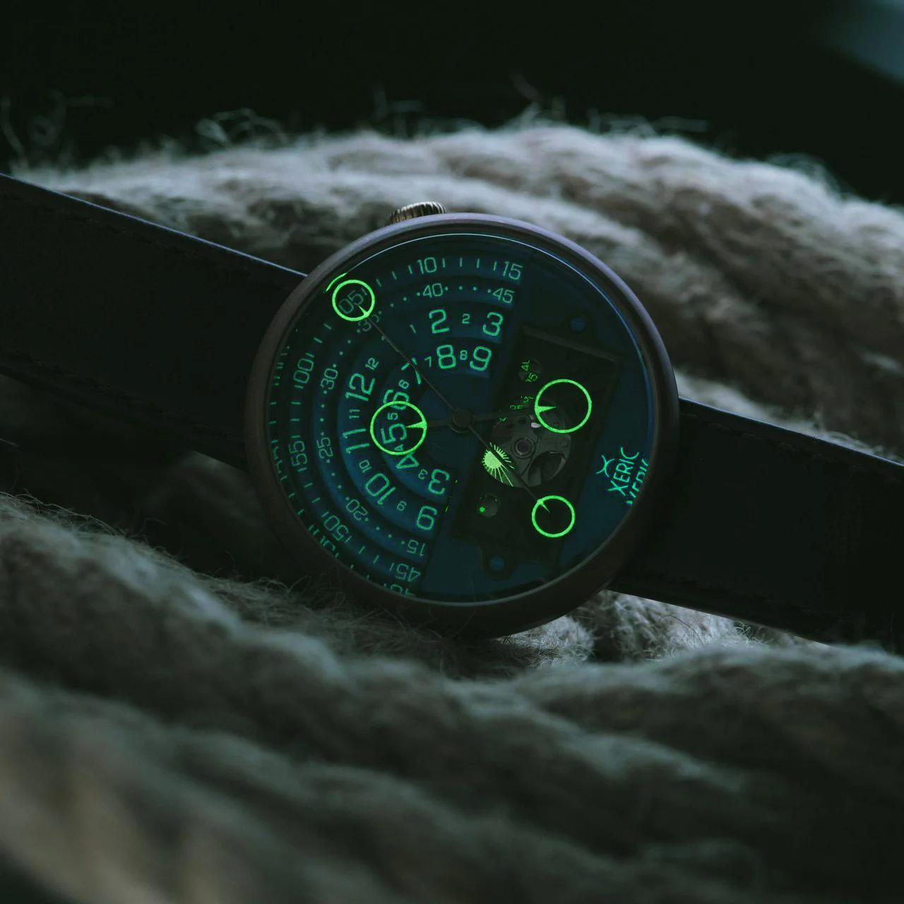 This colorway of the Halograph II Automatic has luminous hands and dials for late night adventures. It works like a light storage battery, where light charges the battery and afterward, the light is continuously emitted.Â