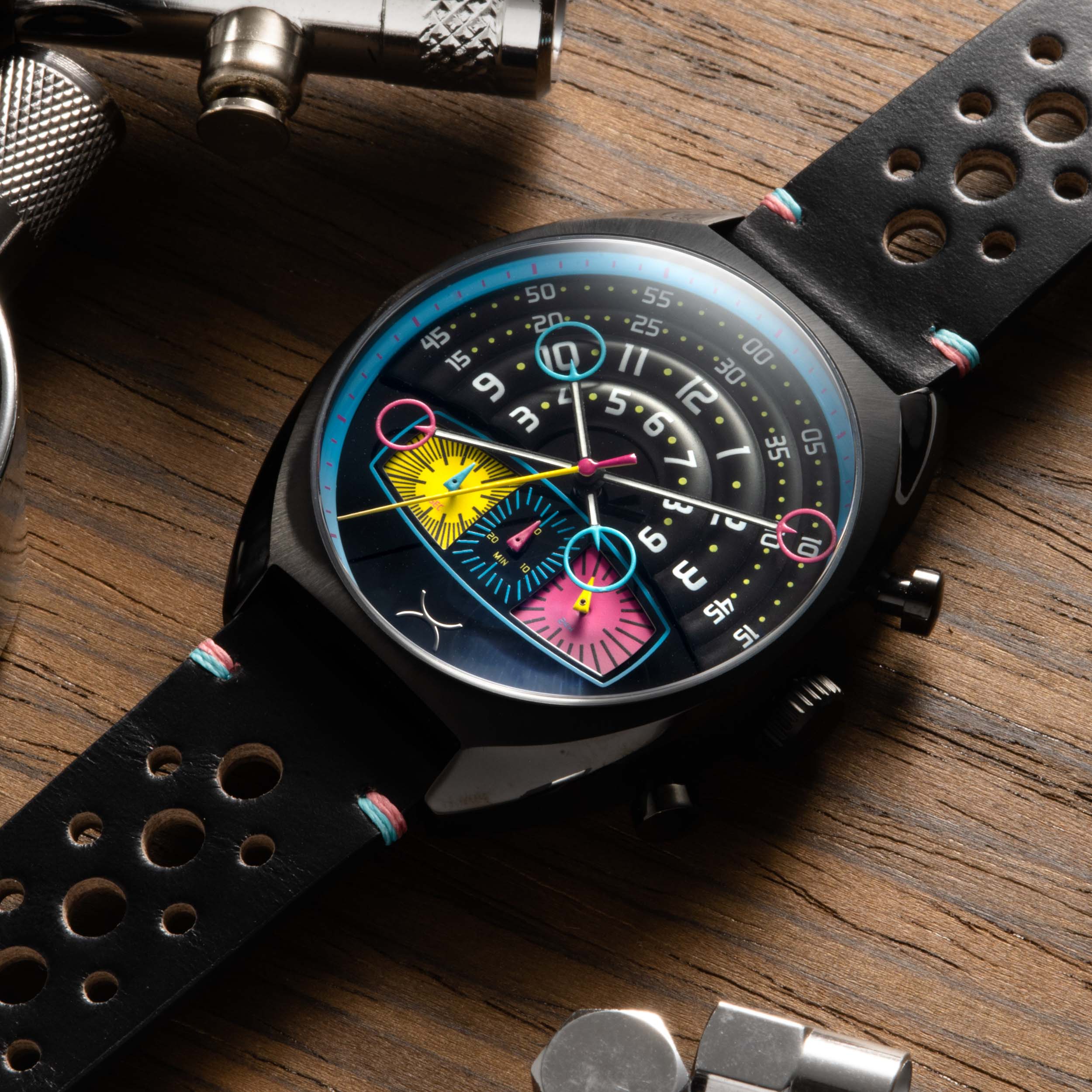 The limited-edition Xeric Halograph III Chrono channels the boundary-pushing spirit of the 1960s, blending vintage watchmaking with bold automotive design. Its upgraded case, striking colors, and retro-inspired linear chronograph—reminiscent of classic dash gauges—are powered by a precise Miyota movement. Xeric’s signature split display makes time easy to read at a glance, while Swiss SuperLumiNova transforms the dial into a traditional-style display in low light.