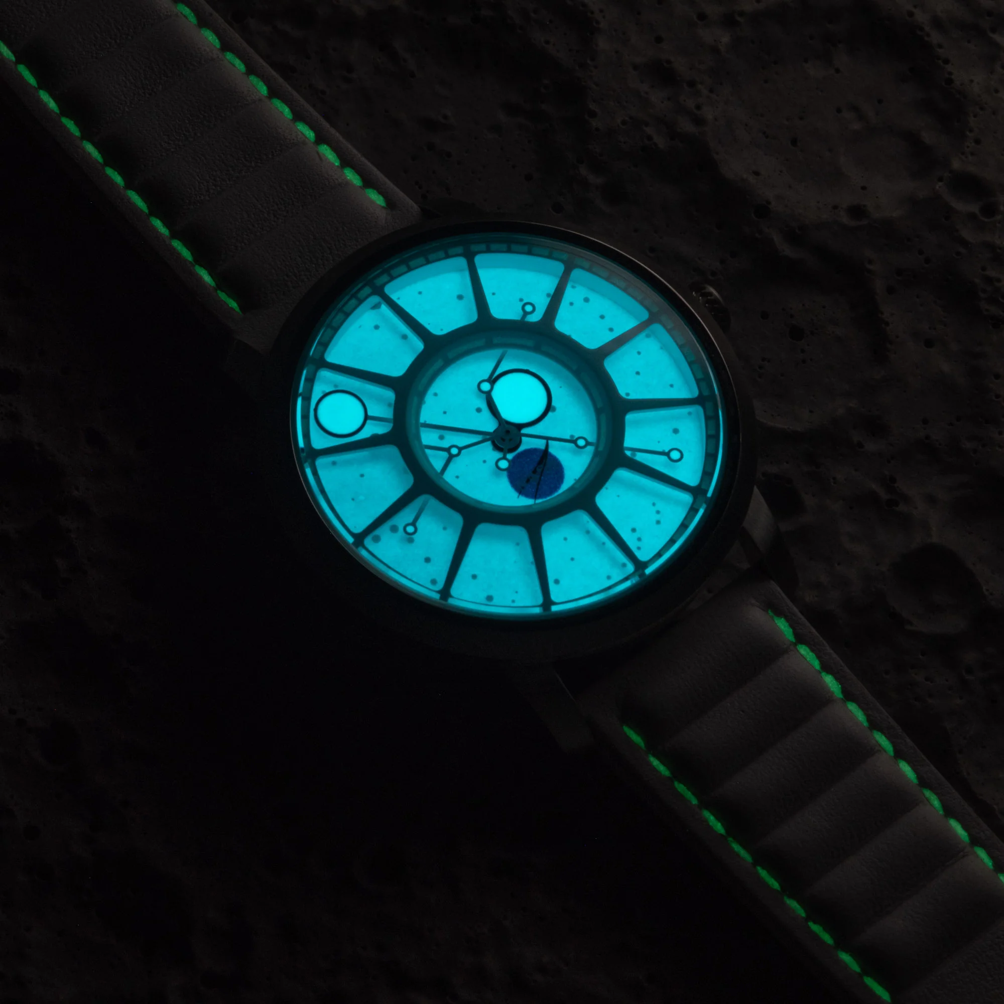 In 1971, the Apollo 15 mission took lunar exploration to the next level when they introduced the first lunar roving vehicle, allowing astronauts to venture out and collect samples further than ever before. 50 years later, the Xeric NASA Apollo 15 Collection celebrates American ingenuity using our signature method of time telling with orbiting moons as watch hands, the hours and minutes float above the miniature solar system backdrop. The grille was inspired by a spacecraft window giving the sense of looking out at the stars. Swiss Super-LumiNova is printed on the inner and outer edge for improved legibility in both light (and especially) dark conditions.