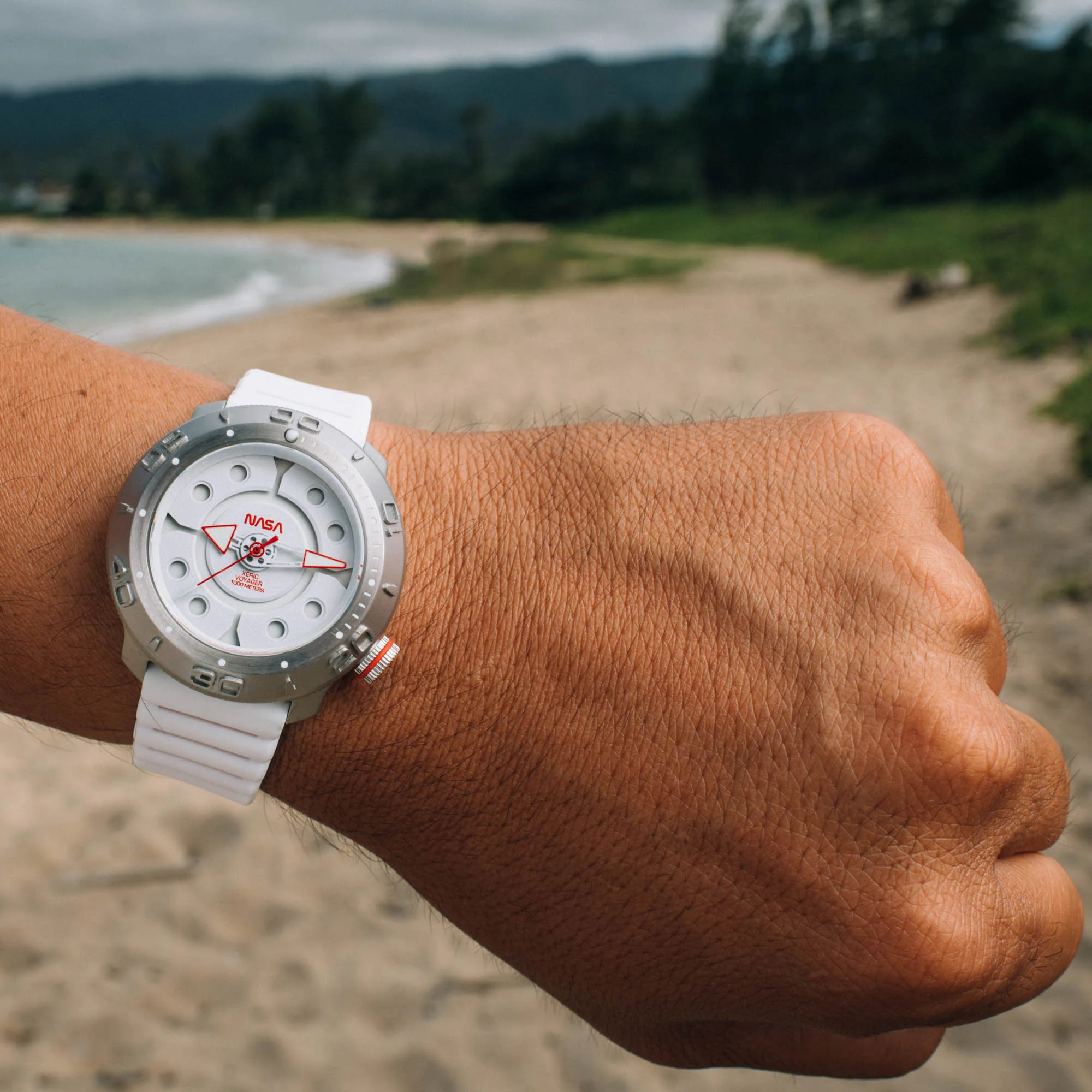 The dial features NASAâs iconic âwormâ logo and a uniquely layered surface. A thick coating of Super-LumiNova is applied to the hands and dial, extending legibility in the dark. The watch dial is protected by an ultra scratch-resistant sapphire crystal.