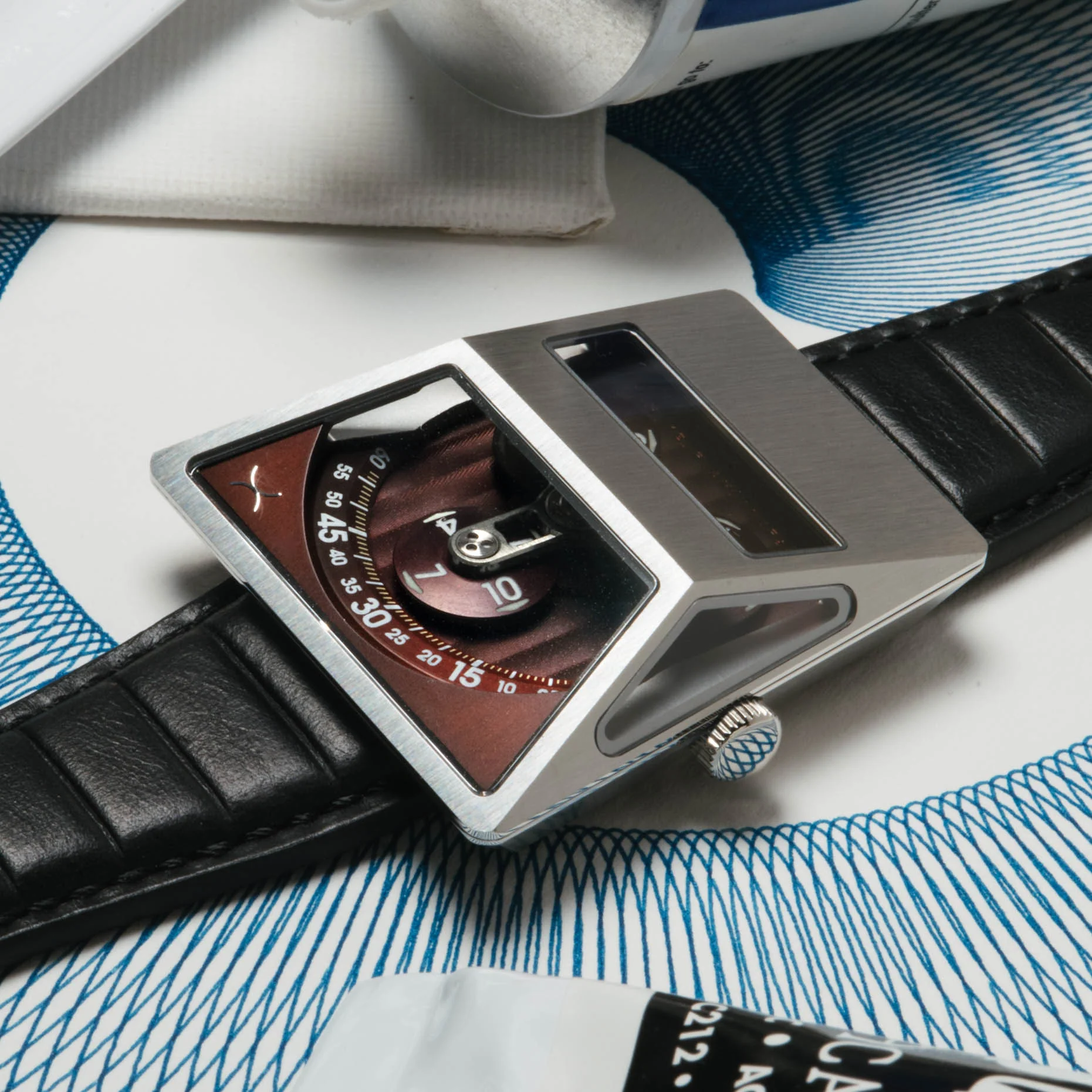 More of a time machine than a traditional watch, the Vendetta X was born from Mitch’s passion for vintage dystopian science fiction and concept cars of the 70’s like the Lamborghini Countach or Bond’s Lotus Esprit submarine. Blending a centuries old wandering hour complication with a unique aerodynamic body & minimalist dial complete this decade long dream. We developed a statement piece for our 10 year anniversary timepiece that reflects some of Mitch's favorite inspirations while expressing who we are at Xeric.
