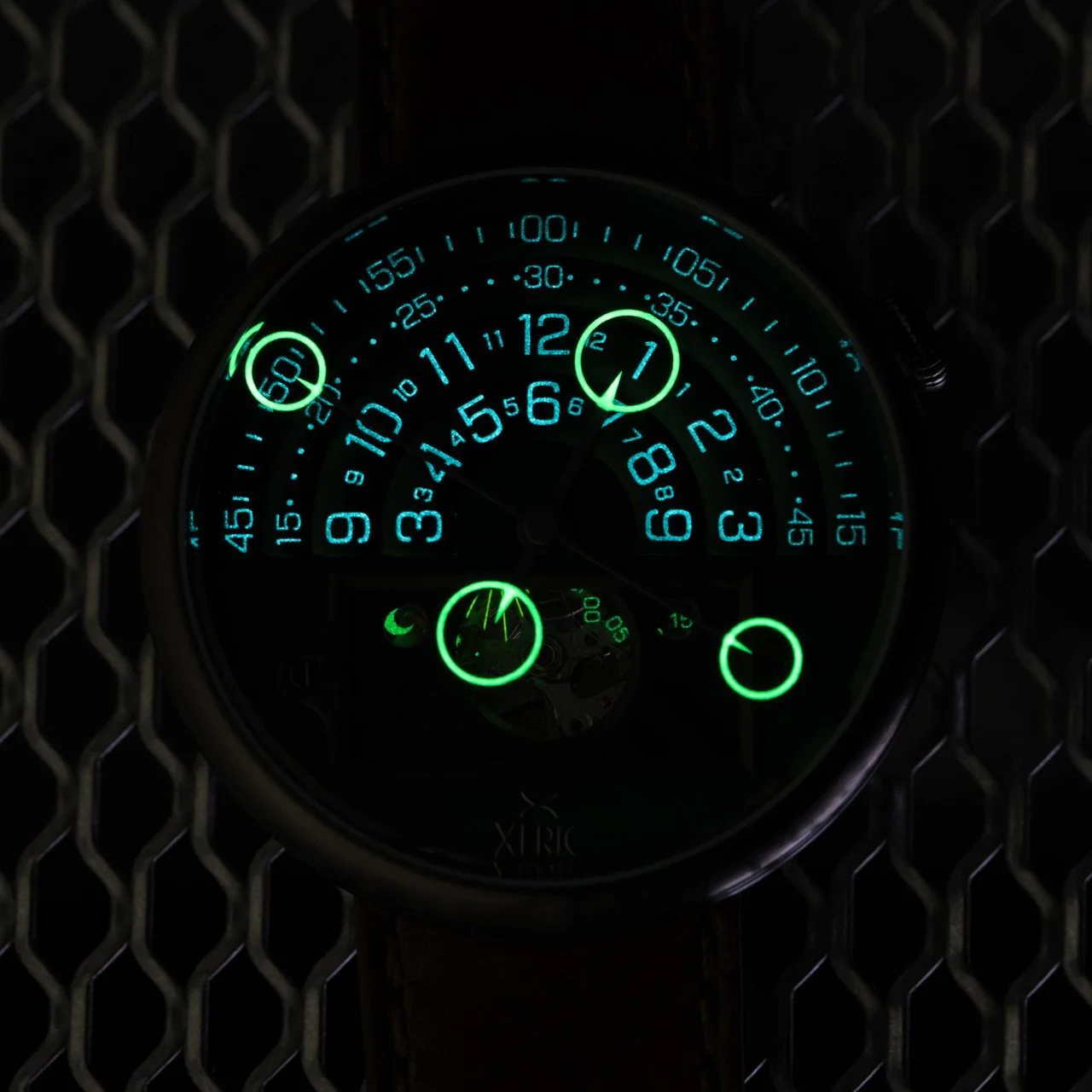 The Halograph II Automatic features Xeric's innovative signature display and halo hands which float over the arcs to encircle the time. The inner arcs display the hours and the outer arcs display the minutes. The time can easily be read through the two halo hands. As the halo reaches the end of its track, a new halo appears on the opposite side, similar to a retrograde display.