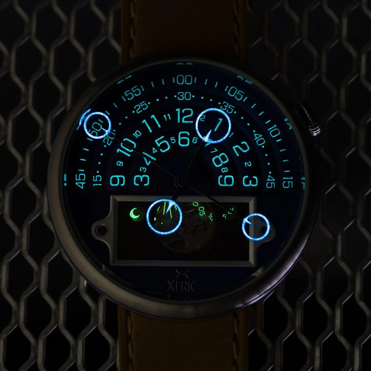 The Halograph II Automatic features Xeric's innovative signature display and halo hands which float over the arcs to encircle the time. The inner arcs display the hours and the outer arcs display the minutes. The time can easily be read through the two halo hands. As the halo reaches the end of its track, a new halo appears on the opposite side, similar to a retrograde display.