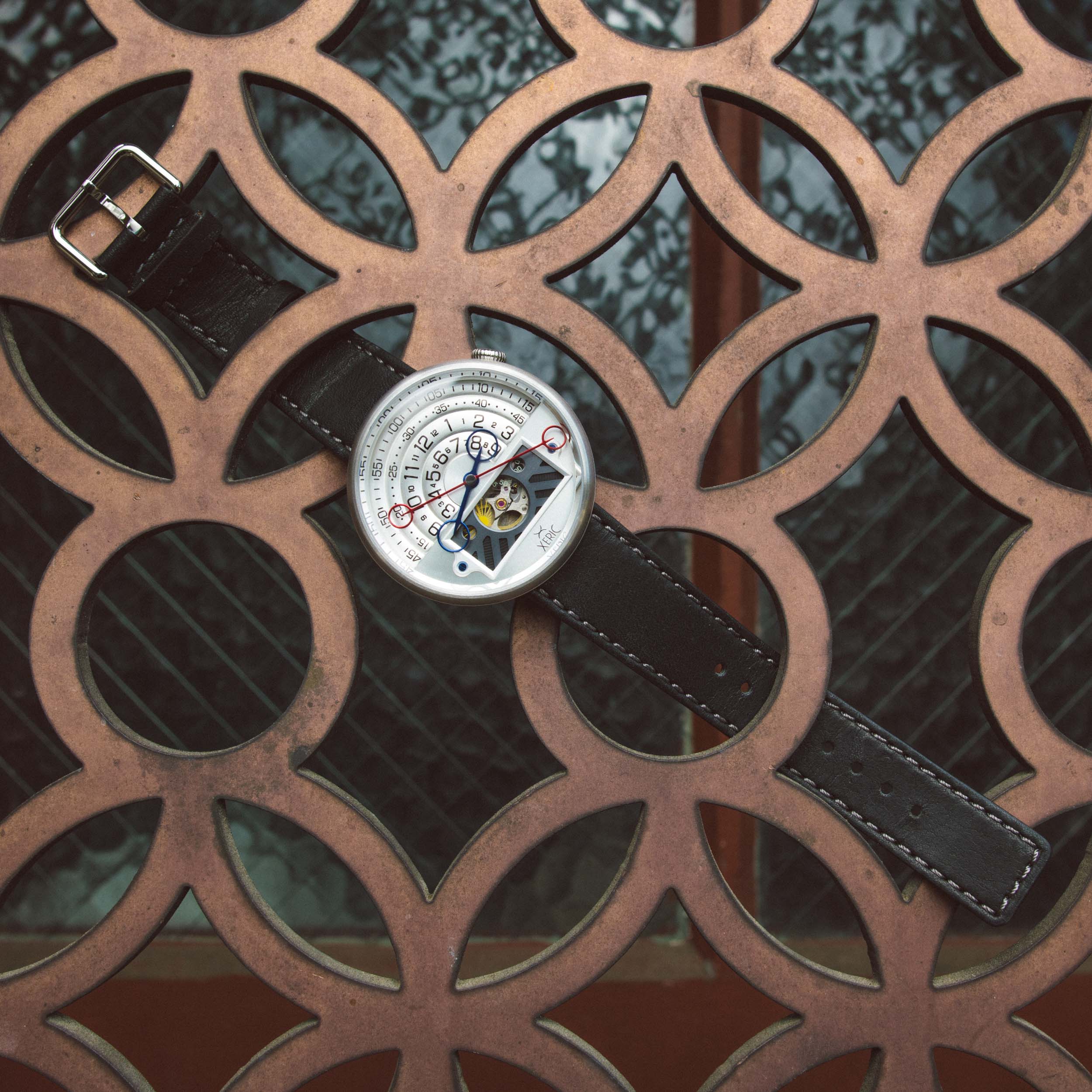 The Halograph II Automatic features Xeric's innovative signature display and halo hands which float over the arcs to encircle the time. The inner arcs display the hours and the outer arcs display the minutes. The time can easily be read through the two halo hands. As the halo reaches the end of its track, a new halo appears on the opposite side, similar to a retrograde display.