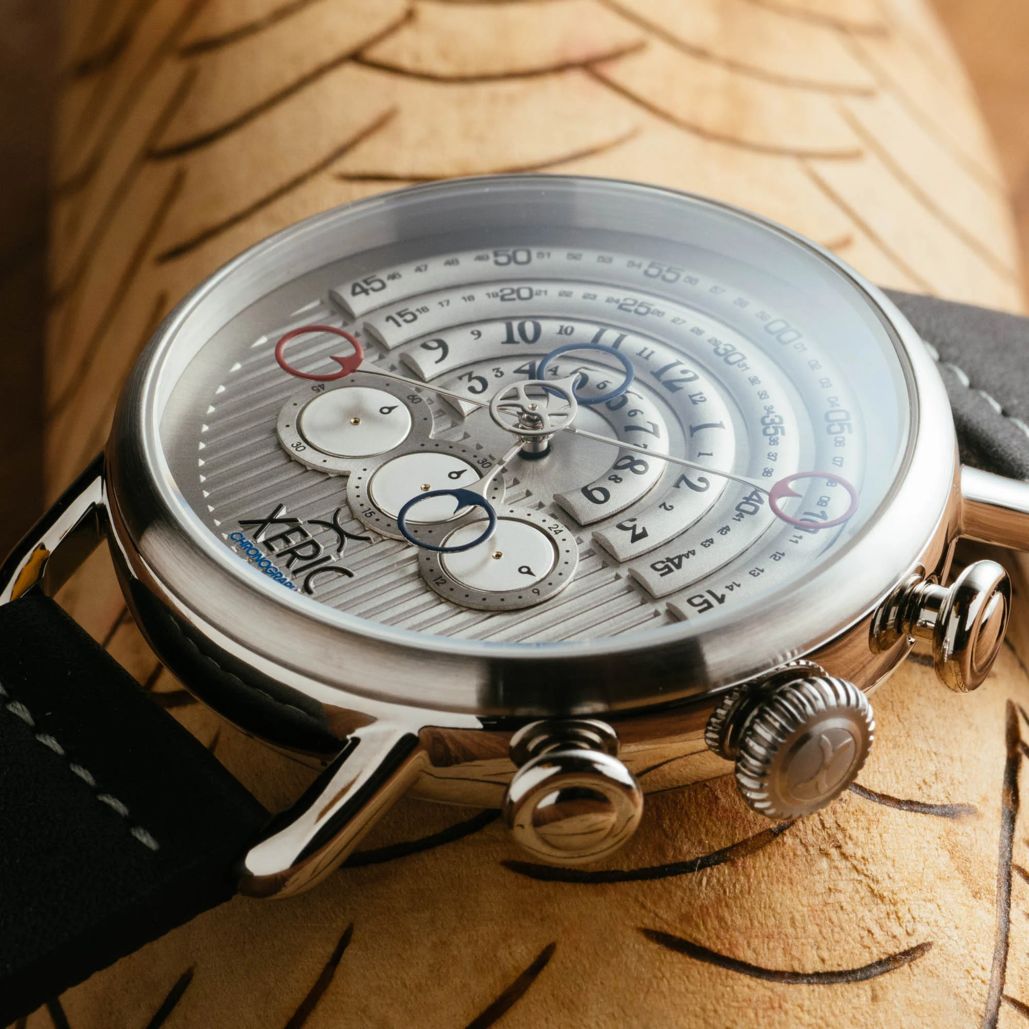 Introducing the Halograph Chrono Sapphire, powered by a Quartz Japanese Miyota movement. This features the same eye-popping design for this quartz iteration of the Xeric Halograph.