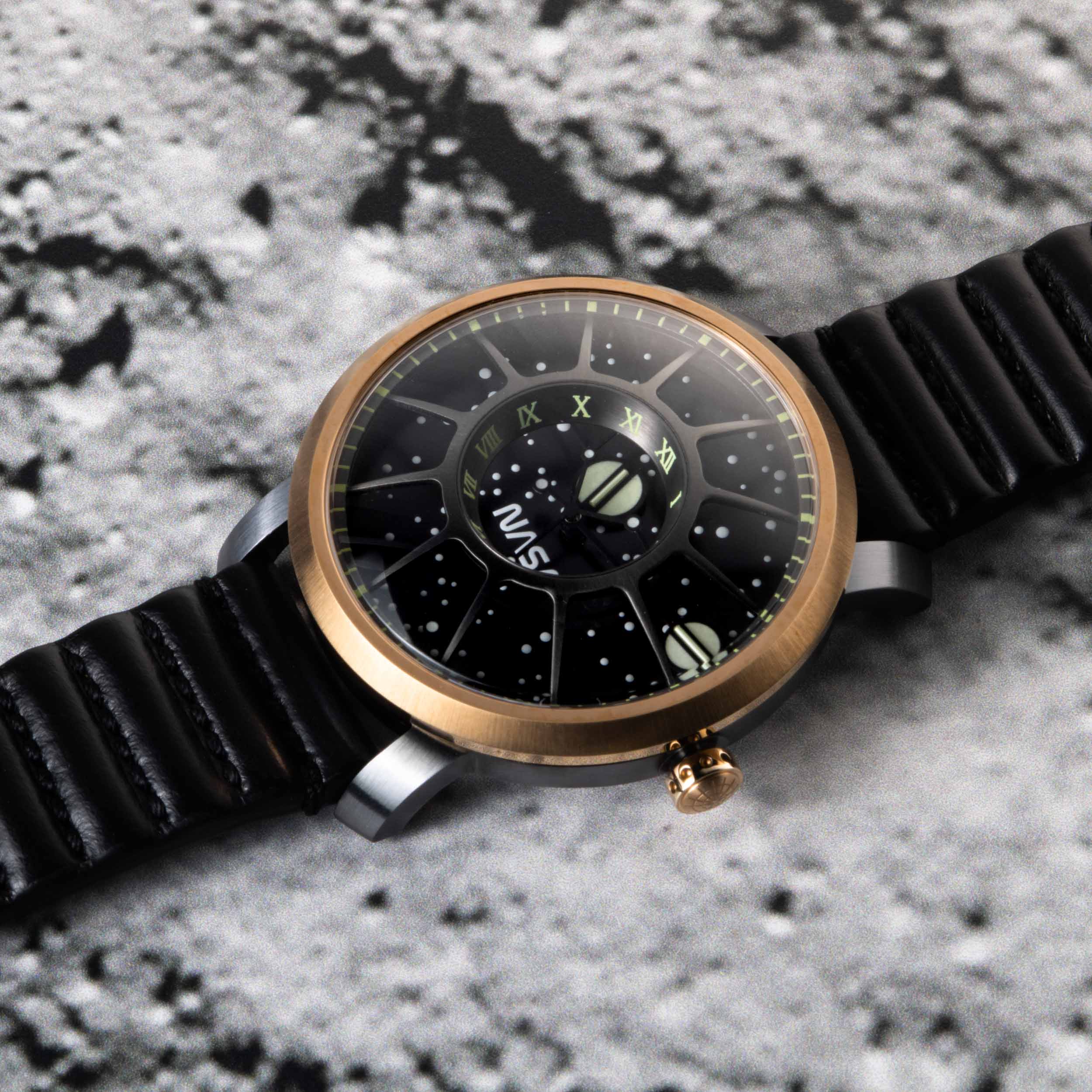 The straps are made from U.S. Horween leather which is ribbed and stitched to pay tribute to the articulated ridge-lines seen on space gloves. In honor of the year of the moon landing, only 1969 pieces of each Trappist-1 NASA Edition colorway will be made and each watch will be individually numbered.
