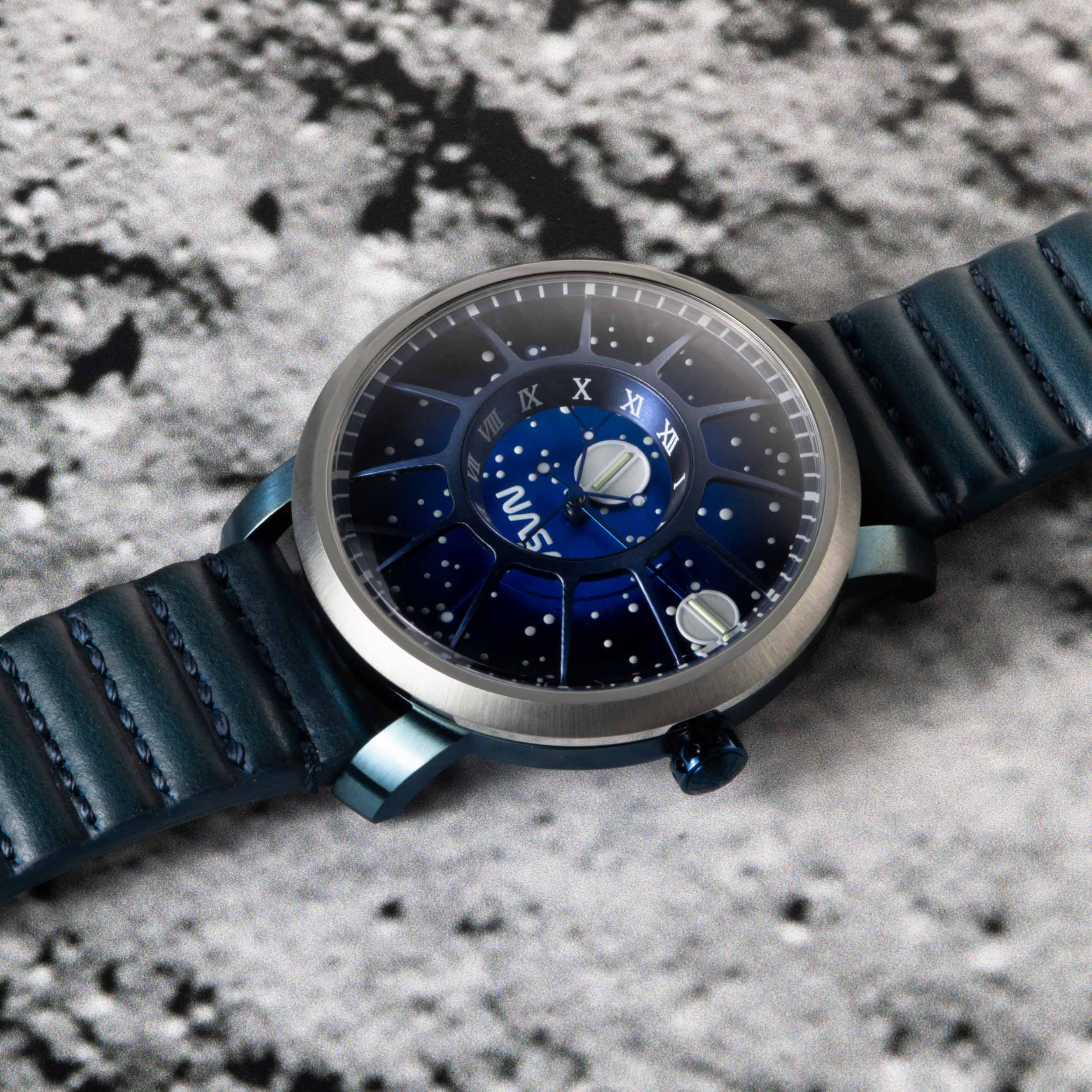 The straps are made from U.S. Horween leather which is ribbed and stitched to pay tribute to the articulated ridge-lines seen on space gloves. In honor of the year of the moon landing, only 1969 pieces of each Trappist-1 NASA Edition colorway will be made and each watch will be individually numbered.